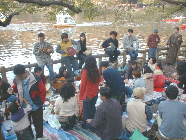 井の頭公園の池のほとりに陣取って,持ち寄りの食べ物とお酒,そして歌と太鼓と弦楽器,幸せな秋の午後・・・